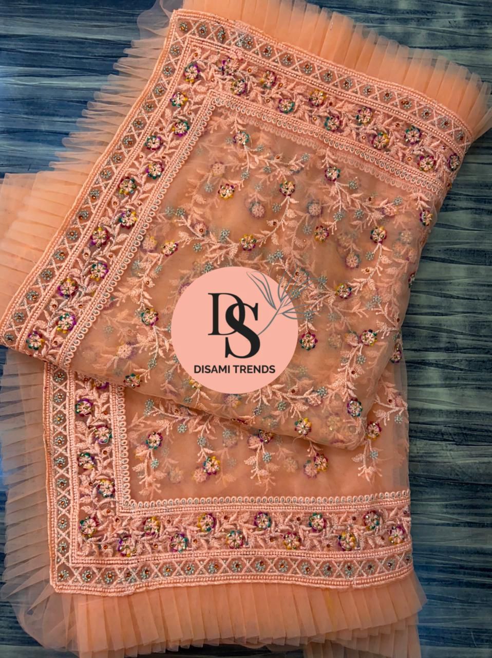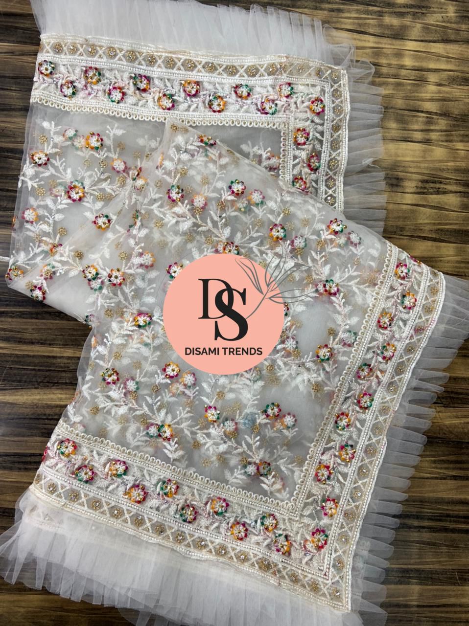 Disami Trends presents a beautiful net saree with embroideried and stone work and ruffle border on it.....comes with blouse piece...